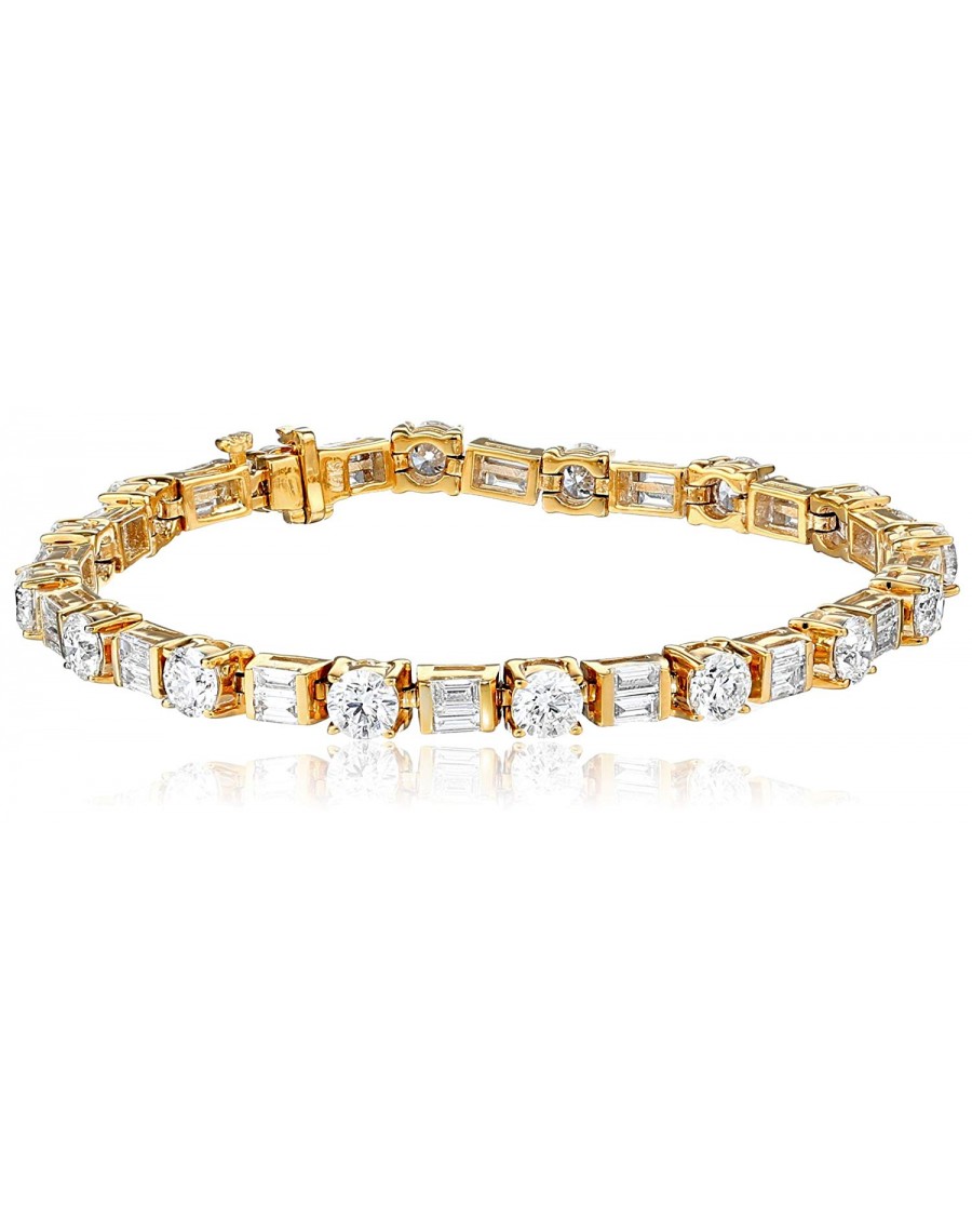 Choose a look of pure luxury with this stunning diamond tennis bracelet, offered in your choice of 14 karat white or yellow gold. It showcases a line of sparkling round and double baguette diamonds, arranged in an alternating pattern in prong and channel settings. There are 16 round and 32 baguette diamonds altogether in this radiant piece, for a total diamond weight of 10.63 carats. The mix of diamond shapes creates a subtle pattern and a beautifully distinctive look. Expertly constructed for a graceful drape, the 7-inch bracelet is finished with a tongue-in-groove clasp and safety bar.